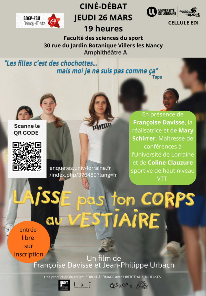 Nous avons le plaisir de vous inviter à un ciné-débat (inscription demandée et gratuite) organisé à la Faculté des Sciences du Sport le jeudi 26 mars à 19h autour du documentaire : “Laisse pas ton corps au vestiaire”