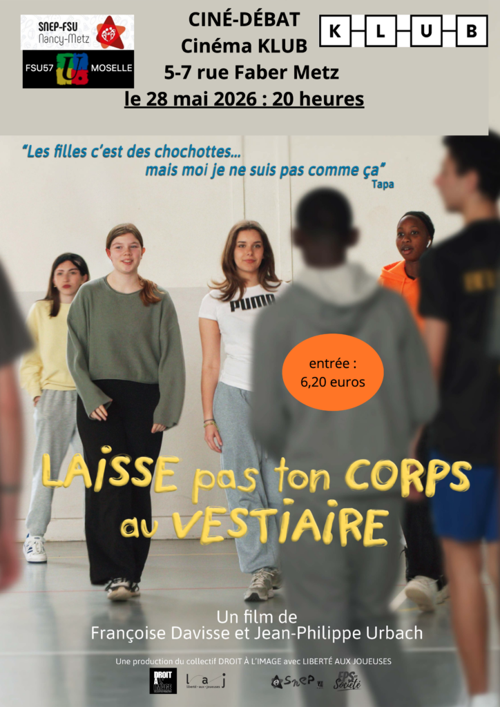Nous avons le plaisir de vous inviter à un ciné-débat organisé le jeudi 28 mai au cinéma KLUB à 20 Heures à Metz autour du documentaire : “Laisse pas ton corps au vestiaire”.
